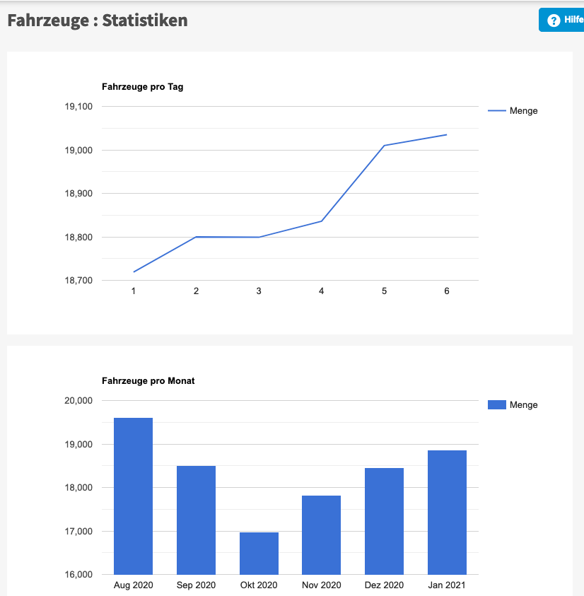 Auf dieser Statistikseite können Sie einsehen, wie viele Fahrzeuge pro Monat mit Ihrer Fahrzeugverwaltung vorhanden waren bzw. aktuell sind.