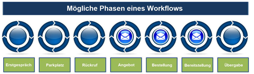 Zum Start bietet Autrado einen Standard-Workflow an, der bereits komplett einsatzbereit ist und der sich nachfolgend anpassen lässt. Ziel eines angepassten Workflows ist ein für den Händler individuell abgestimmter, fest definierter Prozess (Workflow), der in Phasen aufgeteilt den Verarbeitungsablauf festlegt, mit dem alle Mitarbeiter Kundenanfragen bearbeiten.