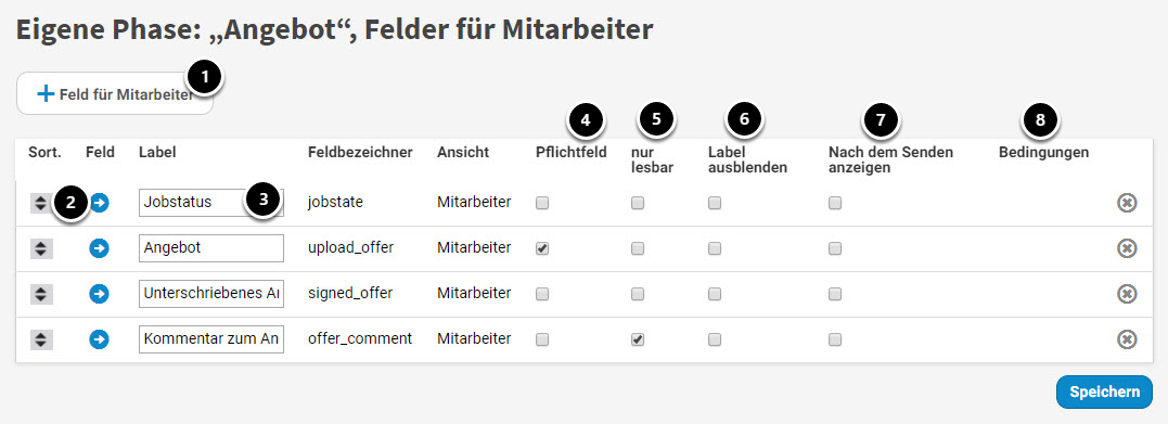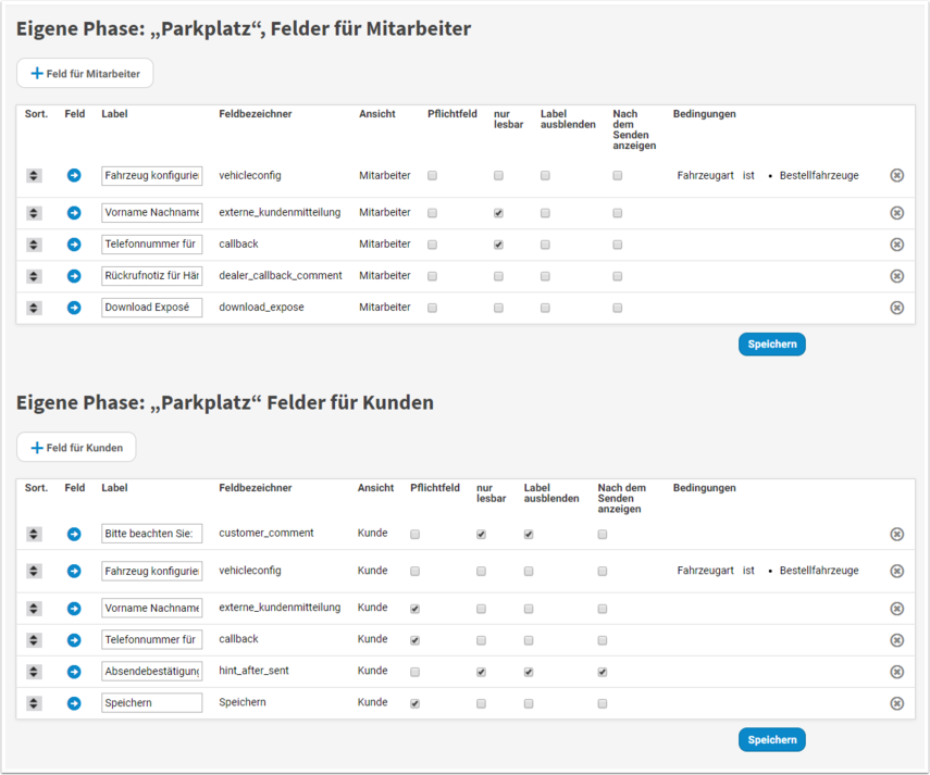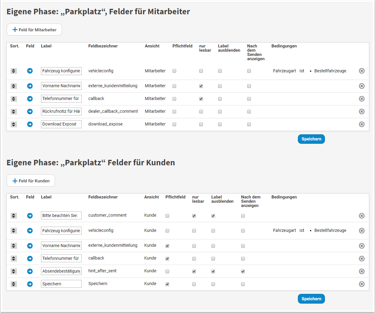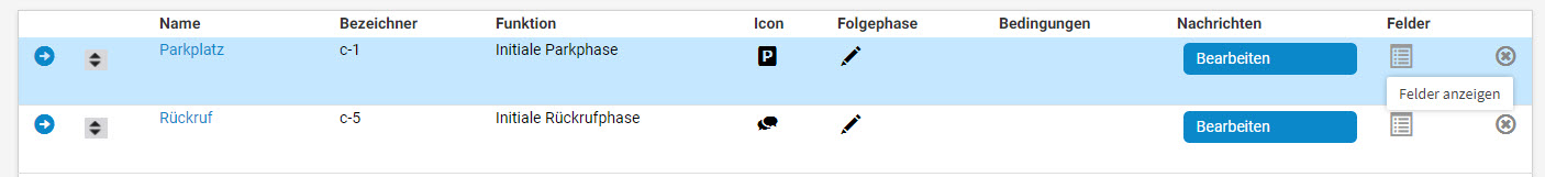 Eine Phase kann als Abschnitt, an dem sich der Vorgang befindet, bezeichnet werden. Phasen folgen üblicherweise logisch aufeinander, können aber auch übersprungen werden. Eine Phase wird aus Feldern "gebaut" und kann eine Mitarbeiter- und/oder Kundenansicht bereitstellen.