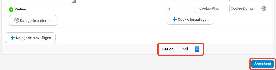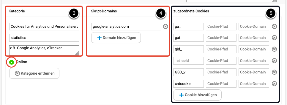 - Kategorien festlegen, wie z.B. Marketing, Statistik etc.; Schlüssel eintragen (maschinenlesbar, für die Speicherung beim Nutzer). Der Button „Online“ aktiviert bzw. deaktiviert eine Kategorie; so können auch komplexe Konfigurationen vorbereitet werden, ohne dass diese sogleich beim Nutzer angezeigt werden