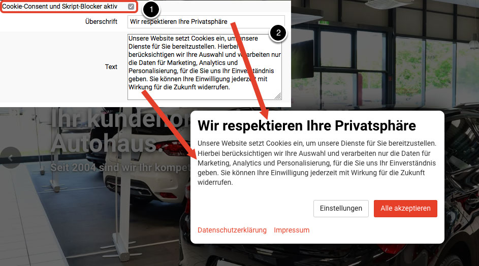 - "Cookie-Consent und Skript-Blocker aktiv" schalten, um Besuchern die Möglichkeit zu geben, die von ihnen akzeptierten Cookies festzulegen. Die Aktivierung bewirkt, dass alle extern eingebundenen Skripte blockiert werden (lokale Autrado-Skripte werden nicht blockiert)