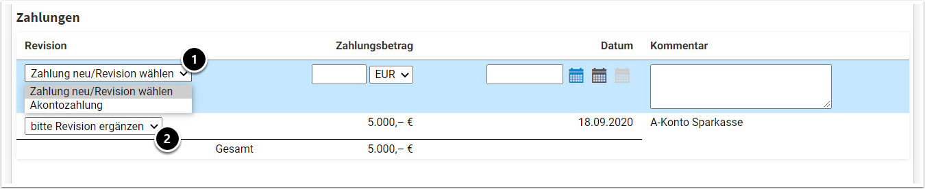 Ist noch keine Rechnung erstellt worden, können Sie dennoch Zahlungen beim Job eingeben (1). In diesem Fall erscheint in der Listbox keine Rechnungsnummer, jedoch eine Postion Akontozahlung. Eine Akontozahlung wird ebenfalls in der Zahlungsliste aufgeführt und kann später (nach erfolgter Rechnungsstellung) einem Beleg zugewiesen werden (2).