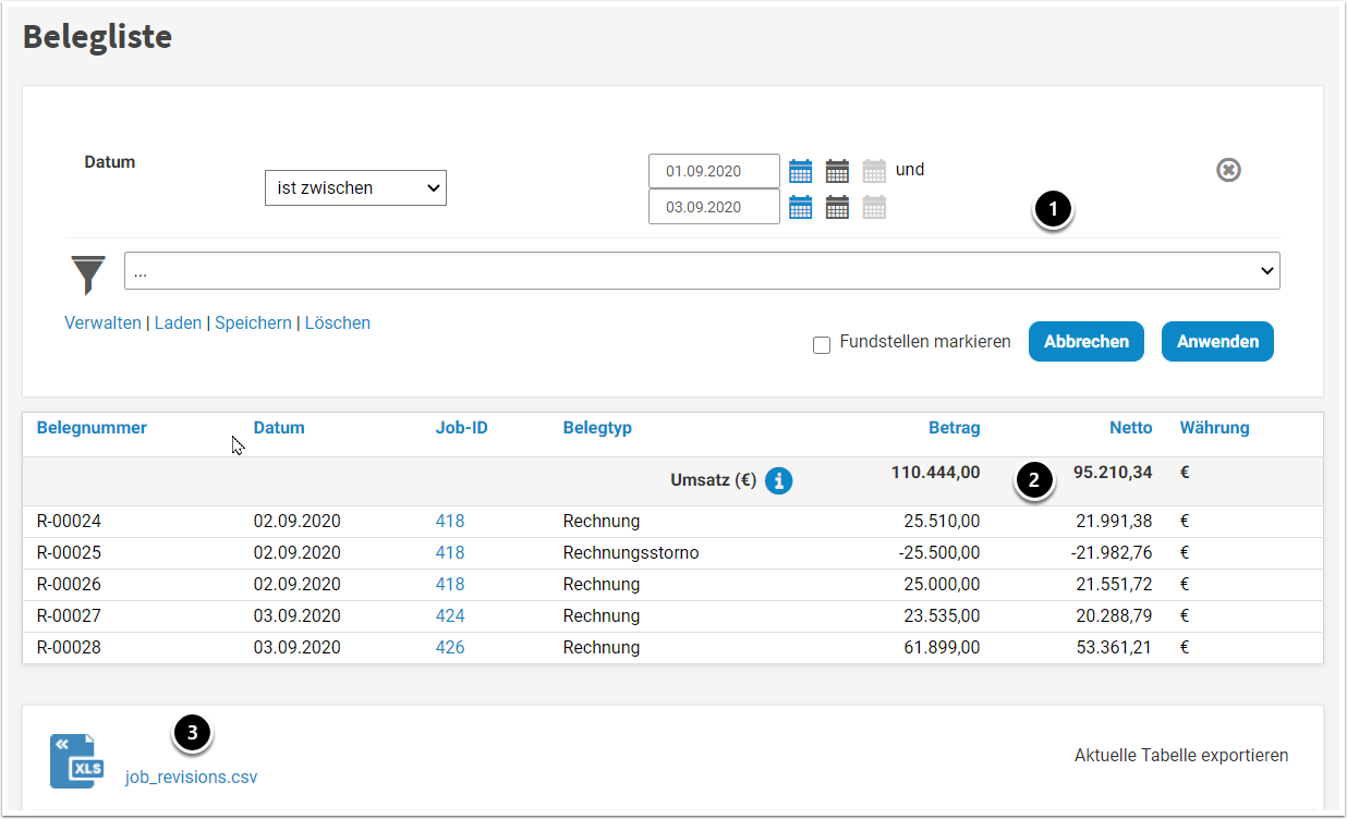 Die Belegliste finden Sie unter » Verkauf » Jobs & Dokumente » Belegliste