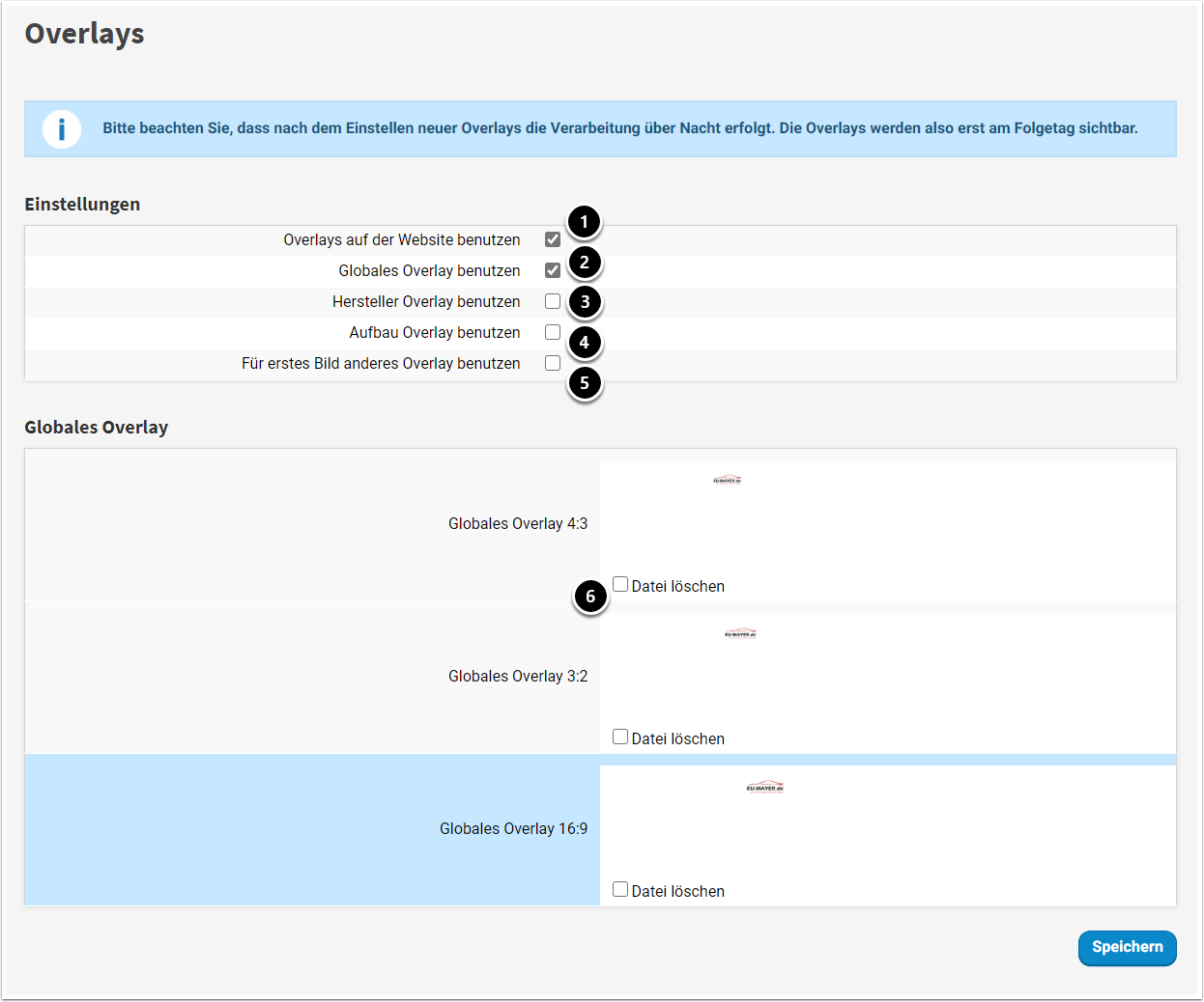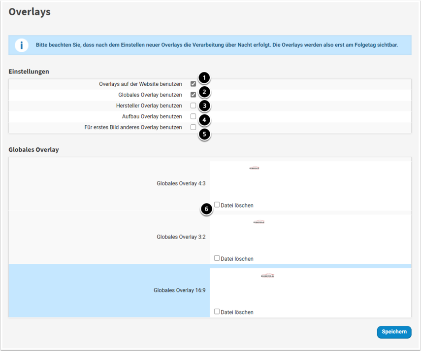 Voraussetzungen: Die Overlays müssen als transparente PNG-Dateien angelegt sein. Um alle Eventualitäten abzudecken, sind diese in 3 Formaten notwendig (4:3, 3:2 und 16:9). Die Overlays sollten zumindest in der Breite 1600 Pixel angelegt werden. Sie können für das erste Bild ein abweichendes Overlay verwenden (gängige Praxis), das mehr werbliche Elemente enthält.