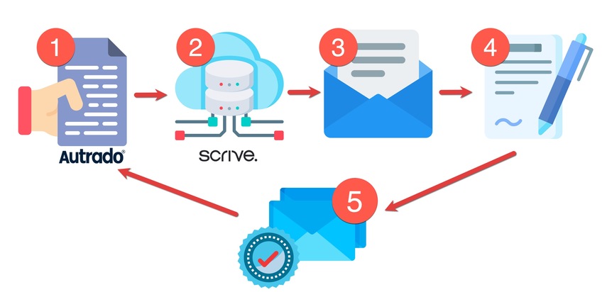 Bei großen Volumen kann die Nutzung der Scrive-API-Schnittstelle eine gute Lösung sein. Hierbei werden die zu signierenden Dokumente direkt von Autrado an Scrive übermittelt, der Kunde jedoch durch eine E-Mail aus dem Jobmanager informiert. Nach Unterzeichnung übermittelt Scrive das signierte Dokument direkt an Autrado zurück.