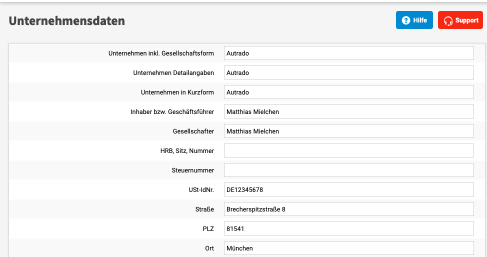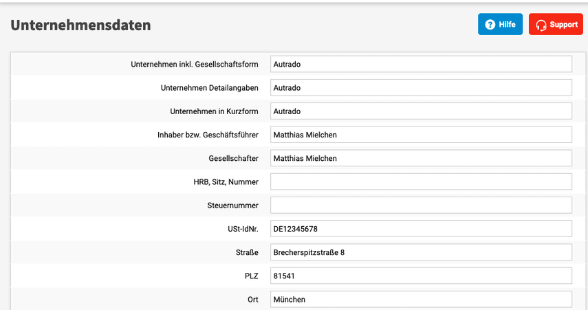 Die Stammdaten des Unternehmens werden hier zentral eingetragen und an vielen Stellen verwendet, wie z.B.