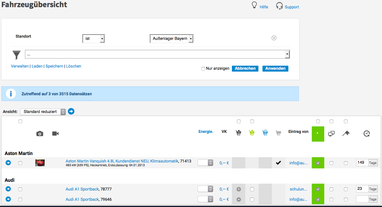 - Filter anklicken, um auf der Bestandsliste bzw. bei den Verkaufsfahrzeugen die dem Standort zugewiesenen Standorte zu sehen:
