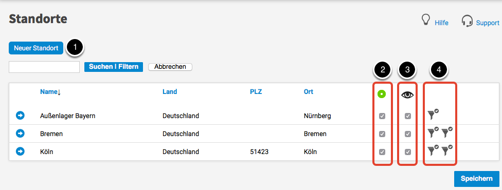 - die Sichtbarkeit von Standorten aktivieren, wenn Kunden der Standort ausgegeben werden soll