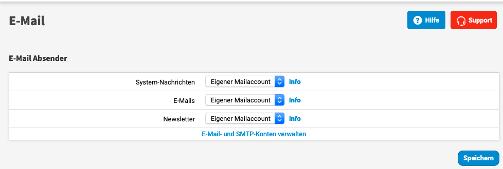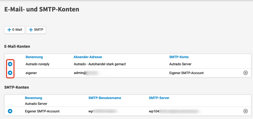 Klicken Sie in "E-Mail- und SMTP-Konten verwalten", um die Einträge einzusehen und zu bearbeiten: