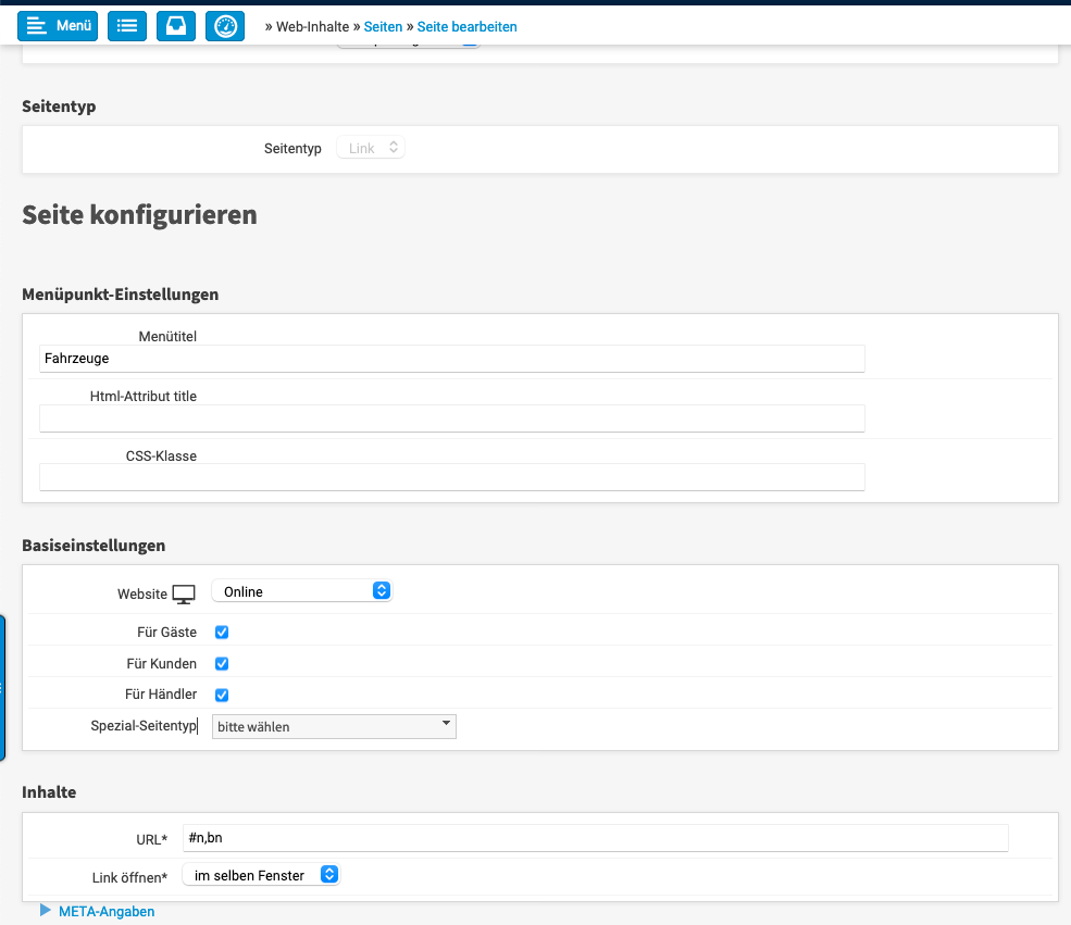 Online ohne Menüpunkt: wenn die Seite zwar gesehen werden soll, aber keinen Navigationspunkt erhält (z.B. SEO-Landingpages) - Für Gäste / Kunden / Händler: legt fest, mit welchen Rollen die Seite gesehen werden darf (Rollen werden Personen zugewiesen)