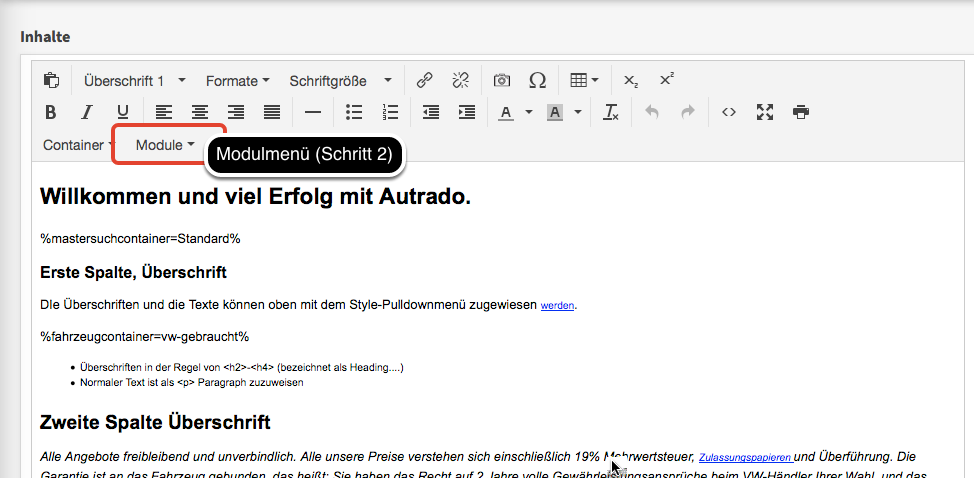 Viele Module werden außerhalb des Inhaltsbereiches der Seiten verwendet; aber einige können auch im Inhaltsbereich über das Modulmenü eingebettet werden: