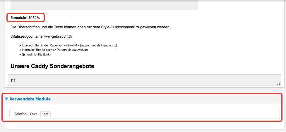 Sie finden in Seiten integrierte Module direkt unter der Seite und können diese durch Anklicken nachbearbeiten: