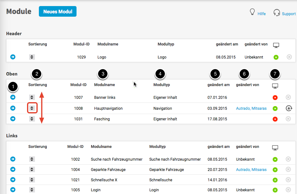 - In dieser Spalte können Sie erkennen, ob das Modul sichtbar ist: grün = sichtbar, rot = ausgeblendet