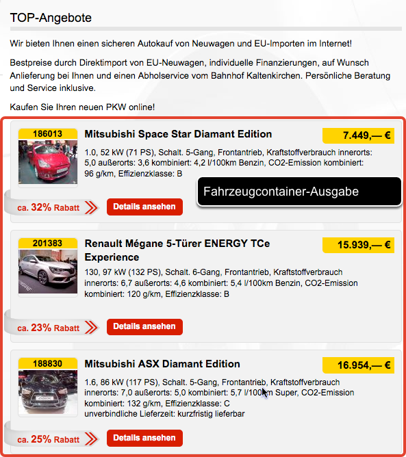 Das gute an Fahrzeugcontainern ist, dass es sich hierbei um eine LIVE-Ausgabe handelt; es werden also stets all die Fahrzeuge ausgegeben, die den Filterkriterien des Fahrzeugcontainers entsprechen, z.B. alle "Audi" von einem bestimmten Lieferanten, die das Wort "Sportback" enthalten; oder alle Gebrauchtwagen, die von Ihnen selbst eingepflegt wurden. Sollten Fahrzeuge aus dieser Auswahl verkauft und offline sein oder neue eingepflegt, ändert sich der Fahrzeugcontainer mit und die Liste "aktualisiert" sich automatisch!