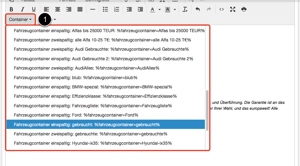 Sie können die Fahrzeugcontainer auf allen Seiten verwenden, auf denen Inhalte / Texte bearbeitet werden können. Sie sehen im Pulldown (1) alle Fahrzeugcontainer, wenn Sie diese Liste öffnen.
