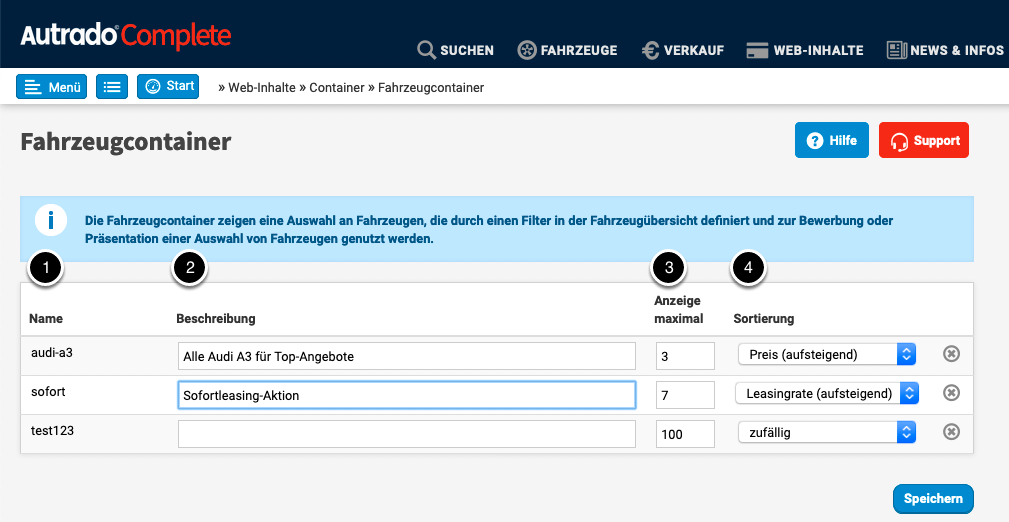 Fahrzeugcontainer können Ihren Kunden eine Auswahl an Fahrzeugen zeigen, die durch einen Filter in der Bestandsliste festgelegt werden. Es handelt sich dabei um Filter, die auf der Bestandsliste erstellt und als Fahrzeugcontainer unter einem bestimmten Namen abgespeichert wurden; und diese Fahrzeugcontainer können Sie im 2. Schritt auf einer Seite verwenden, um die so gefilterten Fahrzeuge Ihren Kunden zu zeigen.