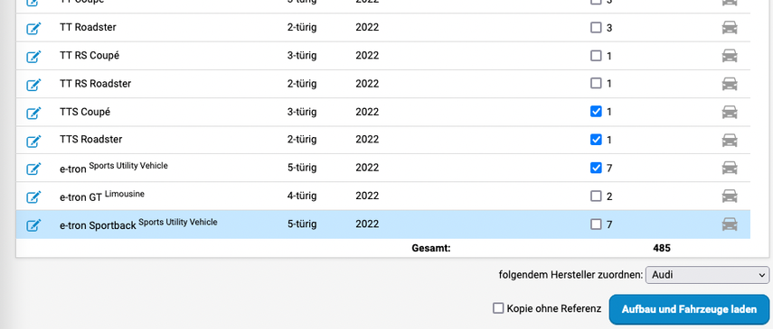 - Haken Sie die Hersteller an, deren Fahrzeuge Sie laden möchten (2). Klicken Sie anschließend unten auf den Aufbau und Fahrzeuge laden-Button.