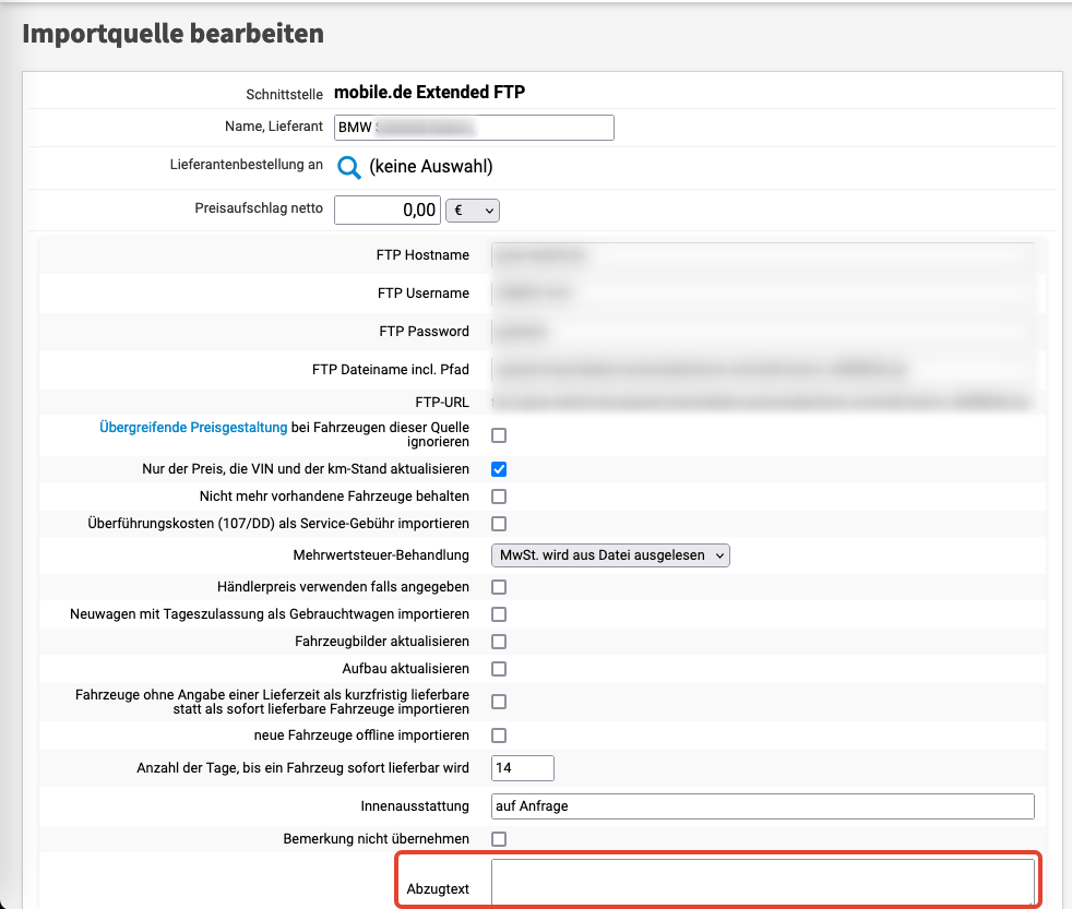 - Zusatz- und Abzugtexte zu importierten Fahrzeugen: um die Beschreibungen importierter Fahrzeuge zu ergänzen, können Sie beliebige Zusatztexte eingeben, die beim Import an alle Fahrzeuge angehängt werden.