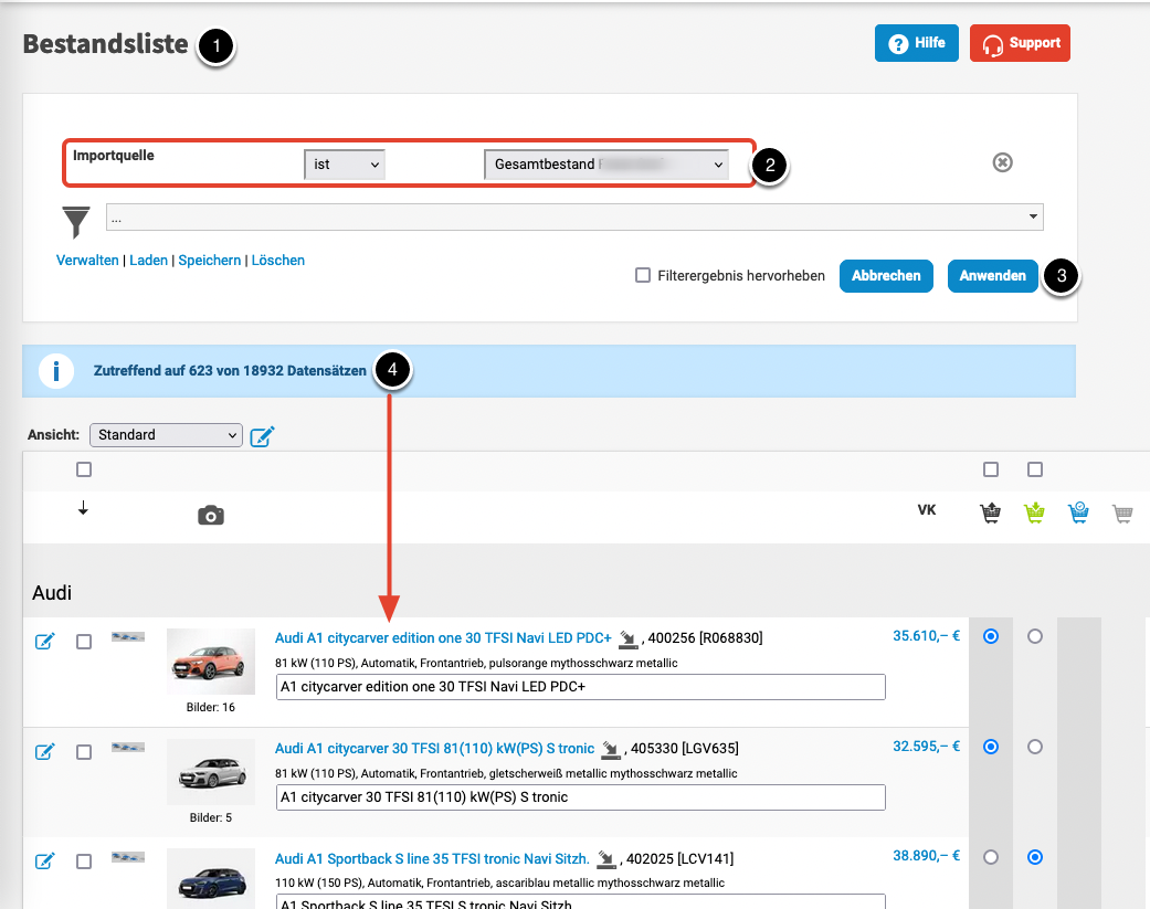 - Bestandsliste aufrufen: Menüpunkt "Fahrzeuge > Bestandsliste" (alternativ auf der Seite "Importübersicht" hinten das Filtersymbol anklicken)