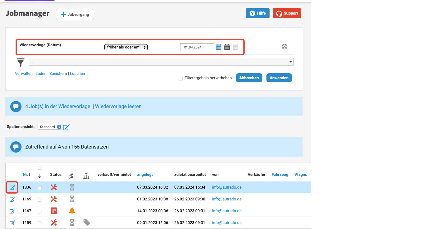 Klicken Sie in das Bearbeiten-Icon, um den anstehenden Job in der Bearbeitungsansicht aufzurufen: