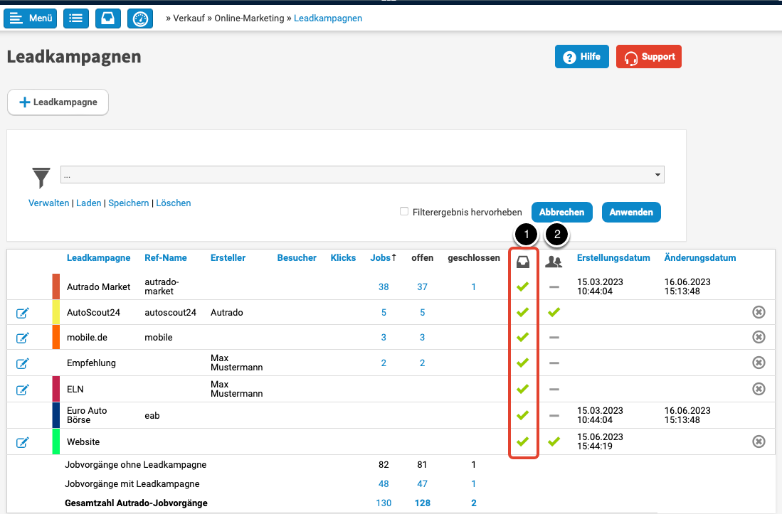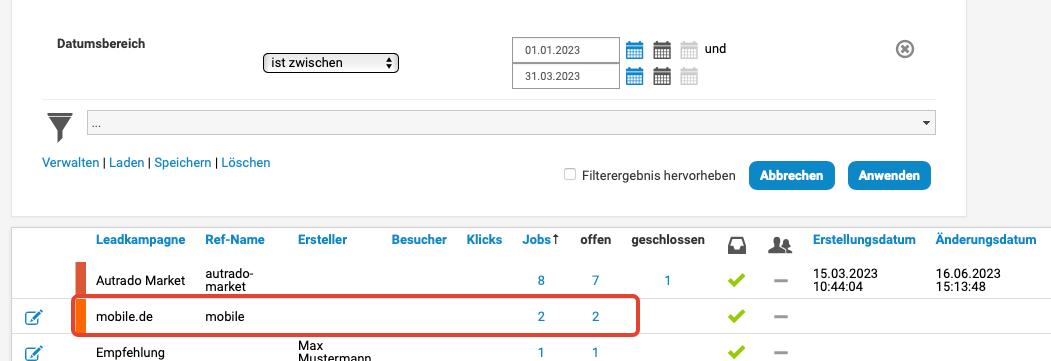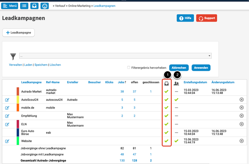 Einige Lead-Kampagnen werden automatisch gefüllt, z.B. durch Lead-Übergaben von Autobörsen wie mobile.de; Lieferanten sehen Autradokunden-Anfragen unter dem Autrado Market-Lead. Klicken Sie in die Zahlen, um die entsprechenden Jobs zu den Leads zu sehen. Ggf. möchten Sie die Ergebnisse noch genauer und filtern danach, ob der Verkauf auch stattgefunden hat.