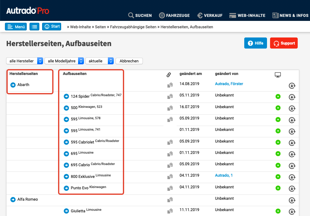 Klicken Sie auf das entsprechende Bearbeiten-Icon, um den Seiteninhalt eines Herstellers wie "Abarth" oder Aufbaus wie "124 Spider" zu bearbeiten.