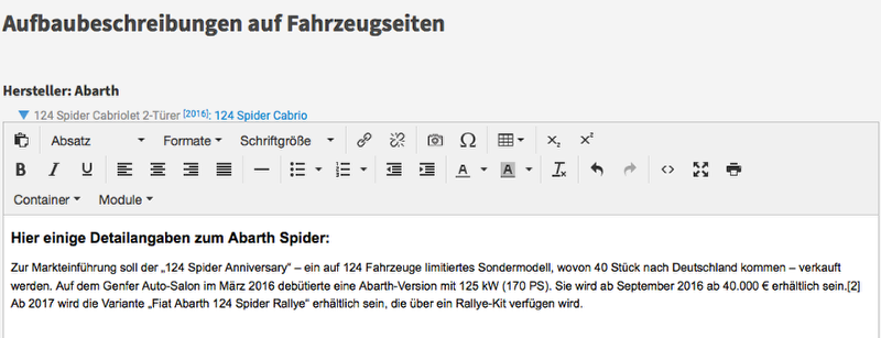 Die hier eingestellten Inhalte werden bei jedem Fahrzeug dieses Aufbaus angezeigt und auch an die Börsen exportiert; die Angaben können zentral gepflegt und gemeinsam genutzt werden.