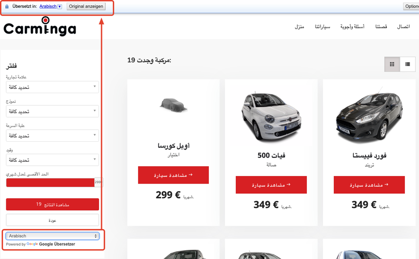 Nach Umschalten in "Arabisch" wird die Website entsprechend ausgegeben, auch im CarConfigurator.