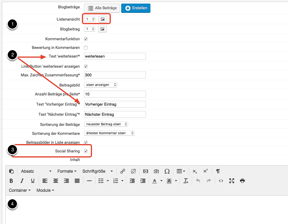 Darunter - bei den Einstellungen der der Inhalte - erhalten Sie Möglichkeiten, Ihren Blog zu gestalten: