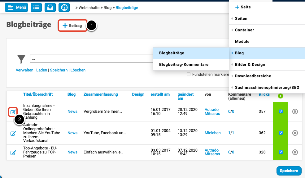 Unter "Web-Inhalte > Blog > Blogbeiträge" können Sie vorhandene Blogbeiträge aufrufen oder auch neue erstellen.