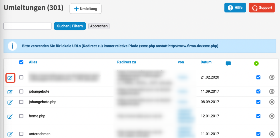 - für einzelne Umleitungen: "+Umleitung"-Button klicken und Alias (alte URL) und Redirect zu (neue URL) einfügen, z.B. durch Einfügen der Zwischenablage