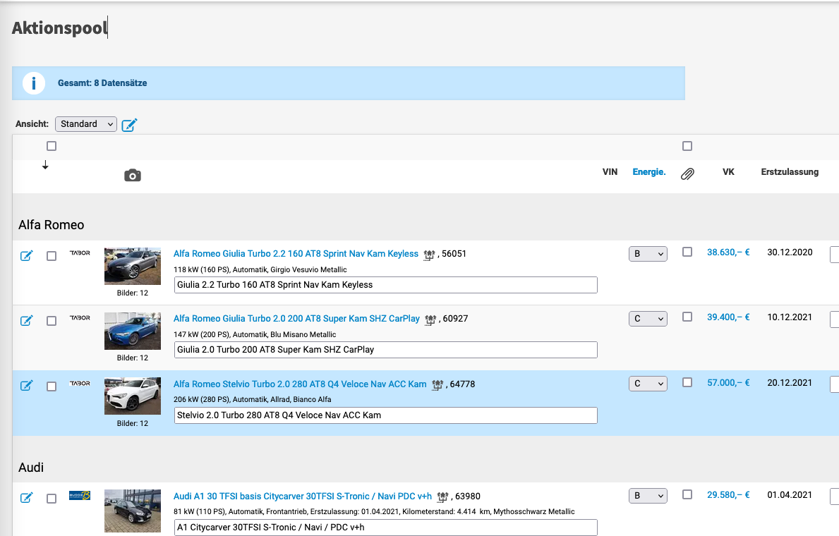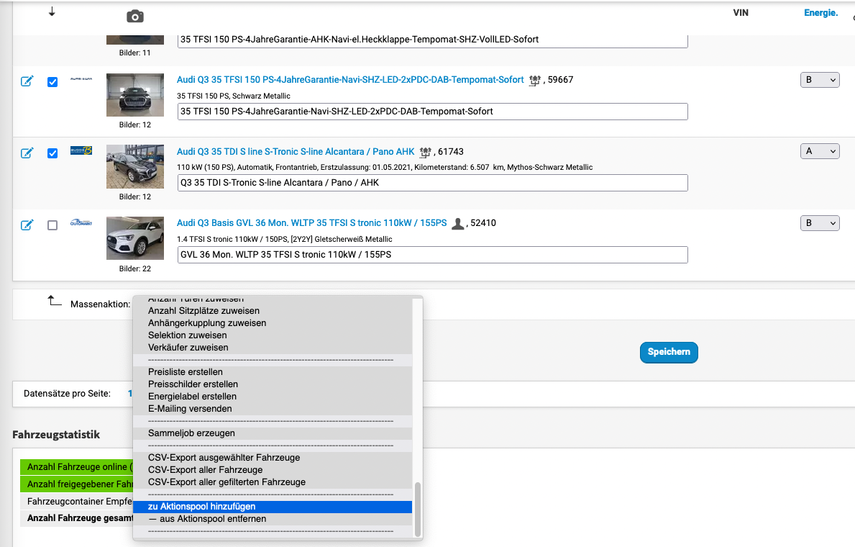 Anschließend werden Ihnen die hinzugefügten Fahrzeuge im Aktionspool angezeigt: Sie erreichen den Aktionspool über "Fahrzeuge / Bestand / Aktionspool: