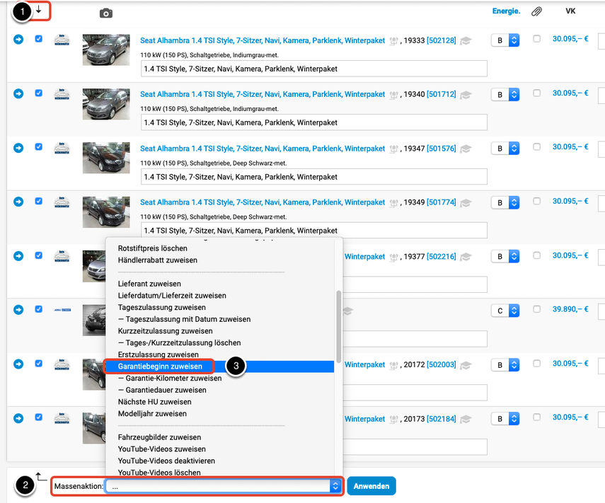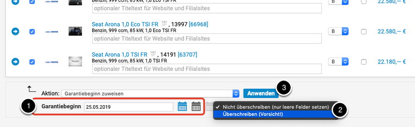 Setzen Sie Massenaktionen ein, wenn Sie die Eigenschaften vieler Fahrzeuge gemeinsam verändern möchten. Wir zeigen Ihnen dies nachfolgend am Beispiel des Garantiebeginns der Fahrzeuge.
