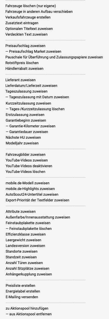 Diese Aktion ist nur ein Beispiel dafür, wie Sie mit Hilfe von Aktionen die Eigenschaften vieler Fahrzeuge gemeinsam verändern können; weitere Aktionen der "Bestandsliste" sehen Sie hier: