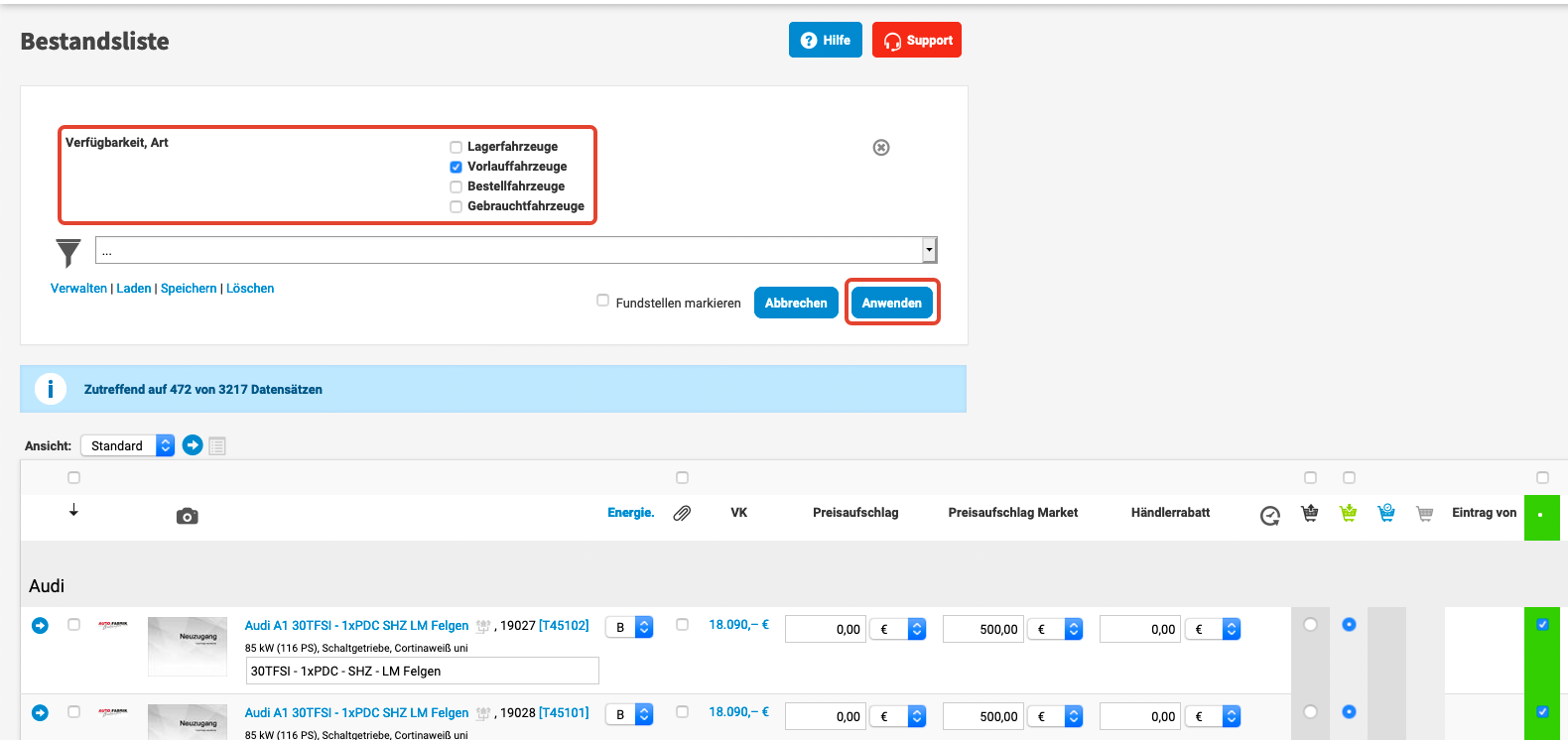 Filtern Sie die Fahrzeuge, deren Eigenschaften Sie ändern möchten (siehe auch "Filter einsetzen"):