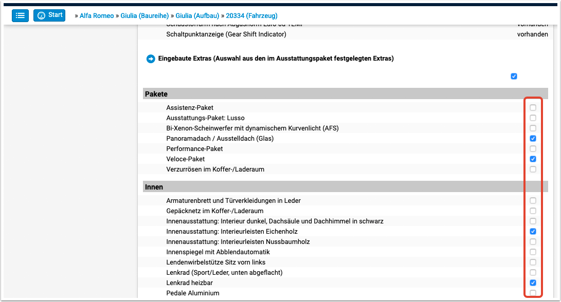 Fahrzeug erstellen-Button anklicken eingebaute Sonderausstattungen anhaken: