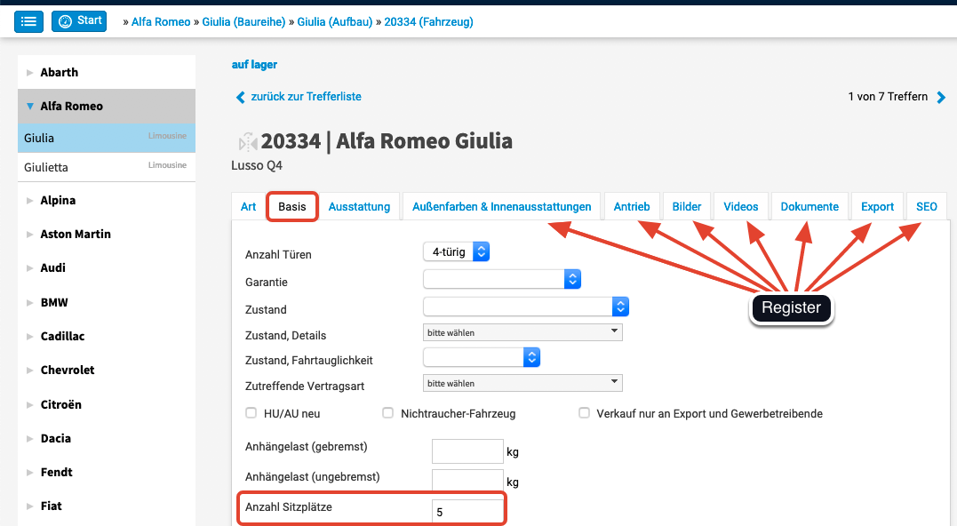 Anschließend können Sie weitere individuelle Fahrzeugdaten eintragen und Preise sowie Fahrzeugbilder einpflegen, indem Sie die Register anklicken.