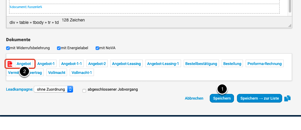 Alle Jobdokumente sind mit Standardtexten vorbelegt, die aus den Dokumentvorlagen stammen. Diese Texte lassen sich pro Job jederzeit individuell verändern. Klicken Sie dazu in den Dokument bearbeiten-Button (2). Damit haben Sie das jeweilige Jobdokument von seiner jeweiligen Dokumentvorlage gelöst und können es abändern (Änderungen der Dokumentvorlagen wirken sich nicht mehr auf solche nachbearbeiteten Dokumente aus).