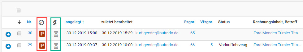 Am Symbol (rot umrandet) erkennen Sie die aktuelle Phase des Jobs, am Symbol rechts davon, ob Sie oder der Kunde am Zug sind (Sanduhr = Kunde am Zug).