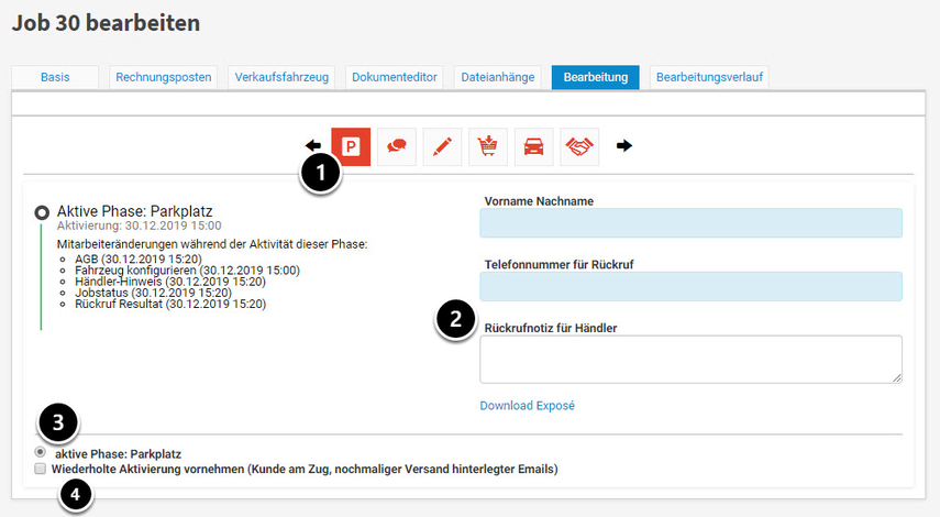 Über den Reiter Bearbeitung ändern Sie die aktuelle Phase, stellen dem Kunden Dokumente oder Informationen zur Verfügung oder ändern den Jobstatus.