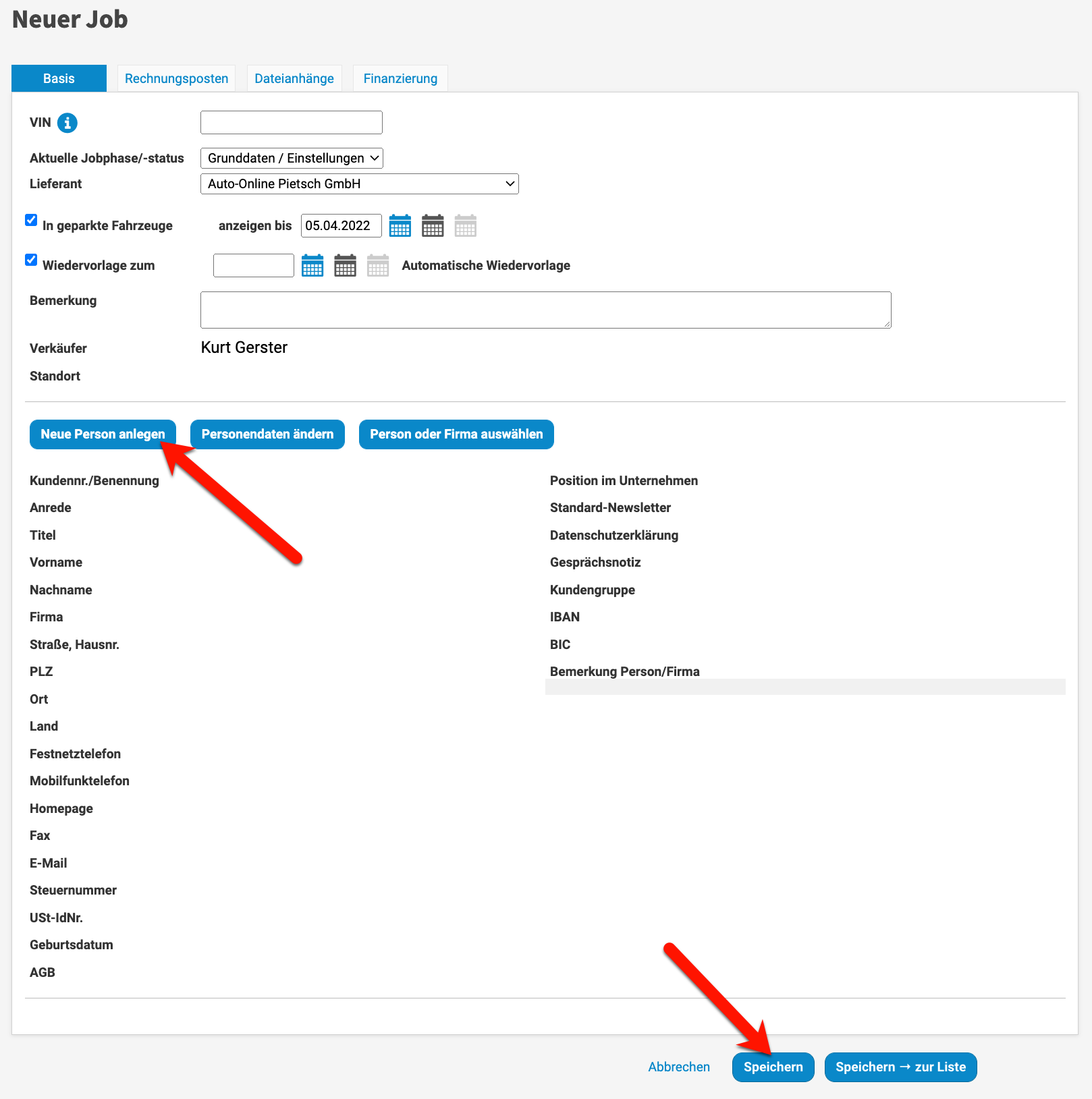 Weisen Sie auf der Seite dem Job einen Kunden zu (oder legen Sie einen neuen Kunden an bzw. ändern Sie vorhandene Kundendaten):