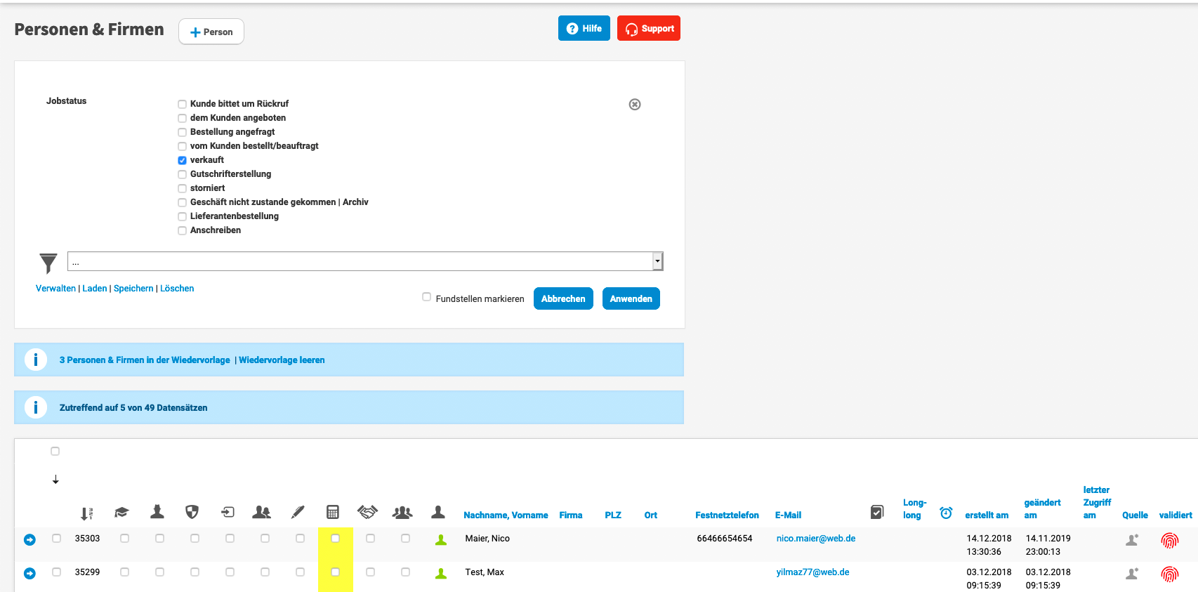 Rufen Sie die Personen & Firmen-Seite auf, und filtern Sie die gewünschten Personen, z.B. alle Kunden, denen ein Fahrzeug verkauft wurde.