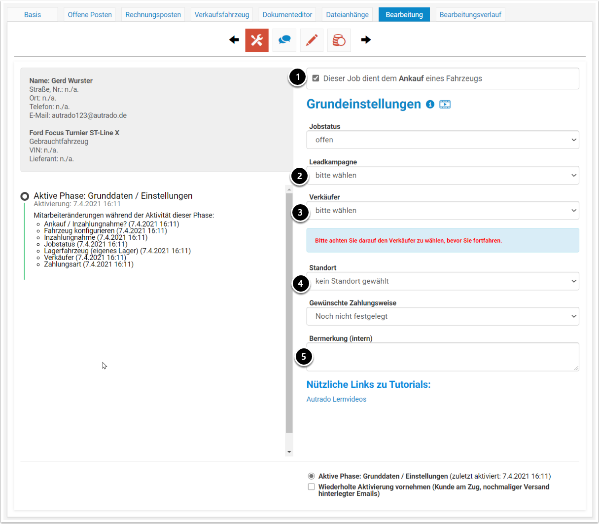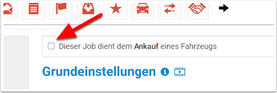 Nachdem Sie den Job erstellt und einen Kunden zugewiesen oder angelegt haben, wechseln Sie zum Reiter Bearbeitung. Sie befinden sich in der Phase Grundeinstellungen. Aktivieren Sie das Kontrollkästchen "Dieser Job dient dem Ankauf eines Fahrzeugs" und speichern Sie die Phase.
