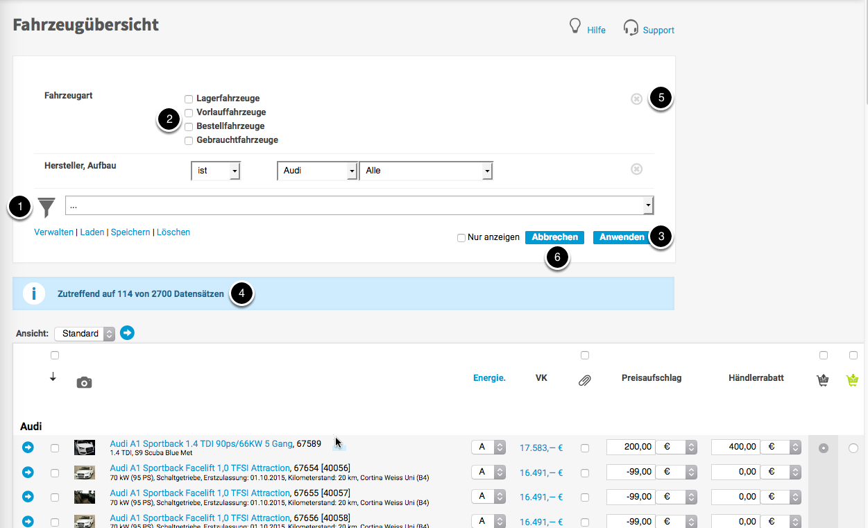 - Anwenden-Button klicken: dabei wird die Bestandsliste auf Fahrzeuge mit zutreffenden Filterkriterien gekürzt