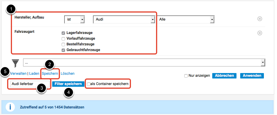- die aufgerufenen Filter erscheinen dabei über dem Filterfunktion - im oberen Beispiel sind das "Hersteller, Aufbau" und "Fahrzeugart"; in Abhängigkeit vom Filter stehen Auswahlkriterien bereit, z.B. Audi Q5