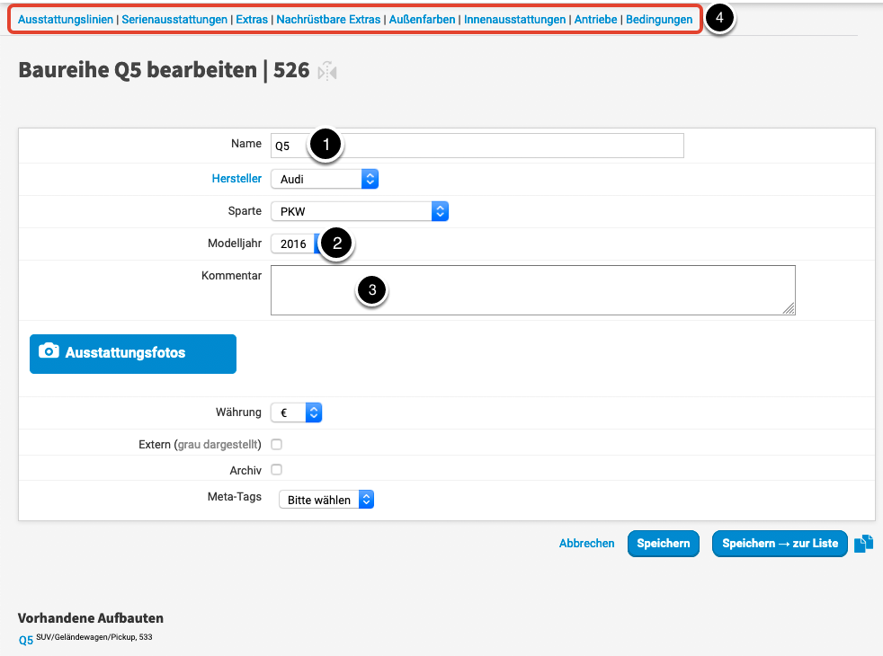 Klicken Sie auf der Seite Baureihe bearbeiten auf den Link Ausstattungslinien (1), um alle vorhandenen Ausstattungslinien zu sehen oder um neue Ausstattungslinien anzulegen. Klicken Sie auf den Link Neue Ausstattungslinie, um diese neu anzulegen oder auf das Bearbeiten-Symbol einer vorhandenen Ausstattungslinie, um diese zu bearbeiten.