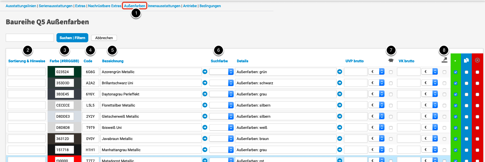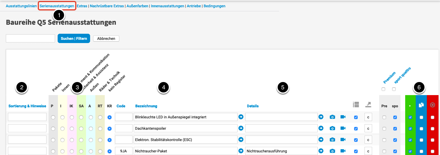 4. Baureihen-Hauptbereiche: Serienausstattungen, Extras, Antriebe, Innenausstattungen und Außenfarben; in diesen zentral verwaltbaren Registern Klartext-Attribute einpflegen und für viele Fahrzeuge aktuell halten