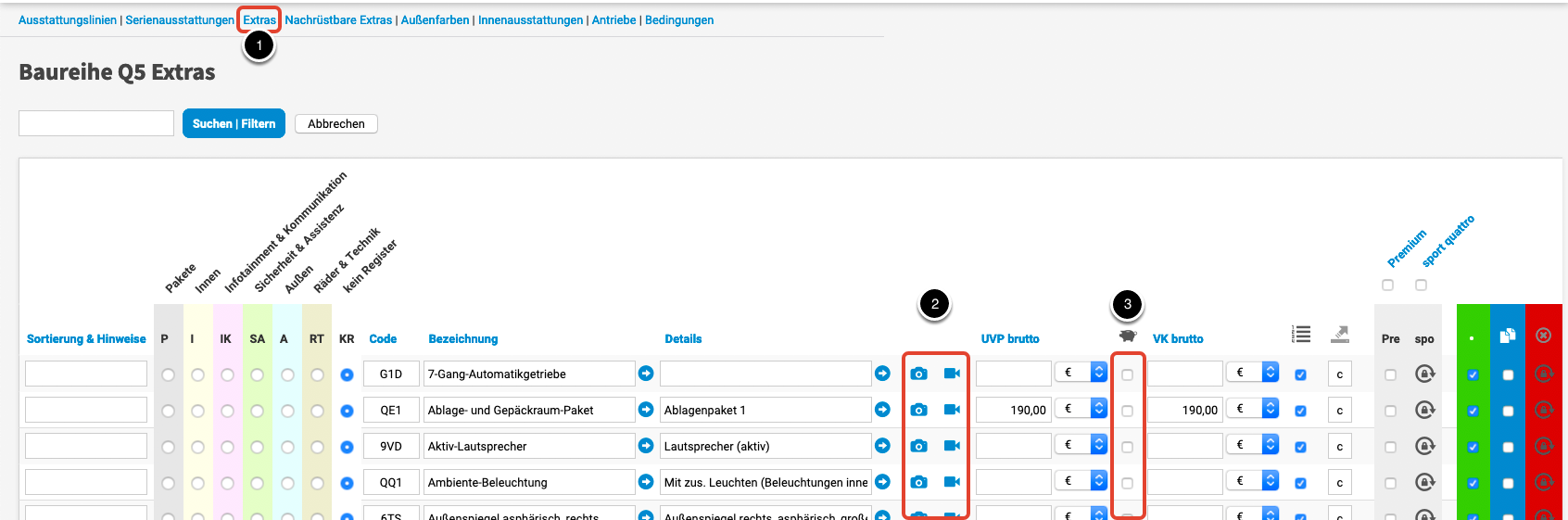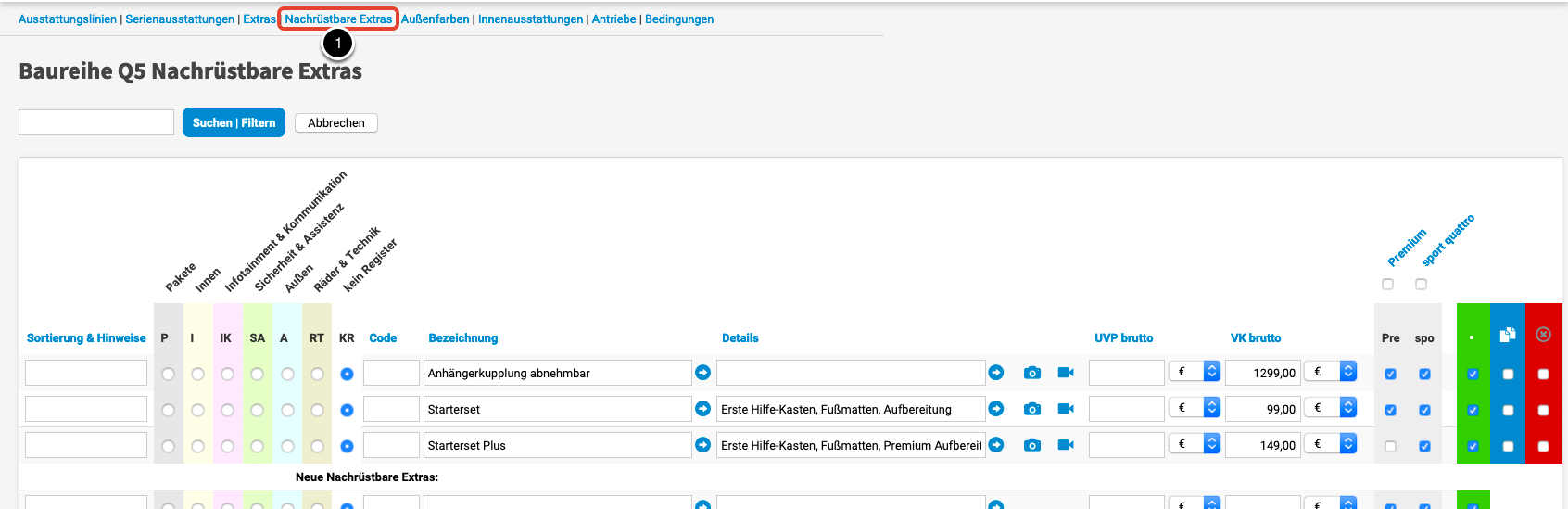 Diese Nachrüstbare Extras (1) können vergleichbar wie andere Extras pro Baureihe eingestellt und den Ausstattungslinien zugewiesen werden.