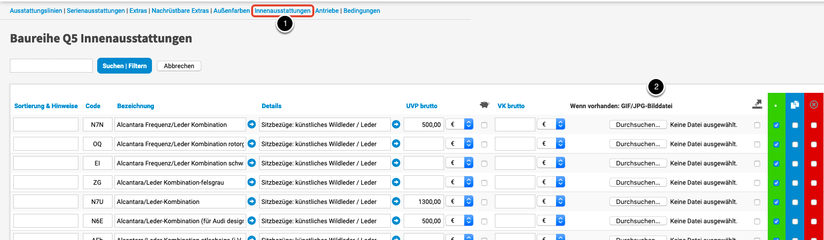 Um Fahrzeuge kundenkonfigurierbar anbieten zu können, benötigen Sie neben den Außenfarben auch eine Eingabemöglichkeit der Innenausstattungen (1) des Fahrzeugs. Grundsätzlich können Sie hier im Feld Bezeichnung sowohl Angaben zum Armaturenbrett, der Polsterung und zu den Teppichen machen (1.024 Zeichen sind möglich). In der Regel sind Fahrzeuge aber mit der Angabe der Polsterfarbe ausreichend genau beschrieben.