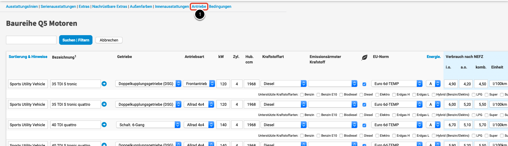 Sie werden Antriebs- und Motorenwerte benötigen, sobald Sie Fahrzeuge einpflegen. Korrekte Motordaten sind die Voraussetzung für korrekte Exporte an Autobörsen sowie ein Schutz gegen Abmahnungen. Klicken Sie auf der Seite „Baureihe bearbeiten” auf Antriebe (1), am Beispiel des Volkswagen Golf Sportsvan.